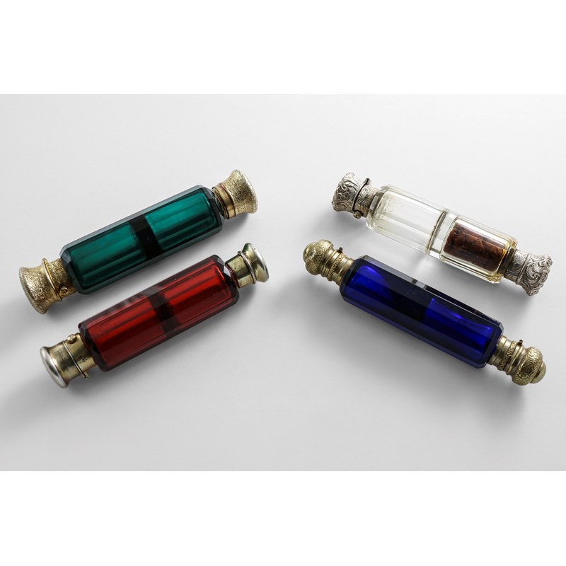 with a faceted tubular body, by S. Mordan & Co., a similar silvergilt-mounted red glass example, monogrammed, unmarked, another silver-mounted clear glass example with chased decoration, and a brass-mounted blue glass example; the latter 5.6" (14.5 cms) long