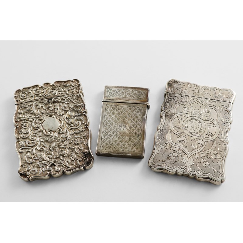 of shaped rectangular outline with chased decoration and a vacant cartouche, by John Tongue, Birmingham 1843, together with an engraved silver example, further decorated with engine-turning, initialled, by Aston & Sons, Birmingham 1858, and a small George IV silver card case with hatched engraving, initialled, by Unite & Hillard, Birmingham, c.1825; the latter 3" (7.5 cms) long; 5.8 oz (3)