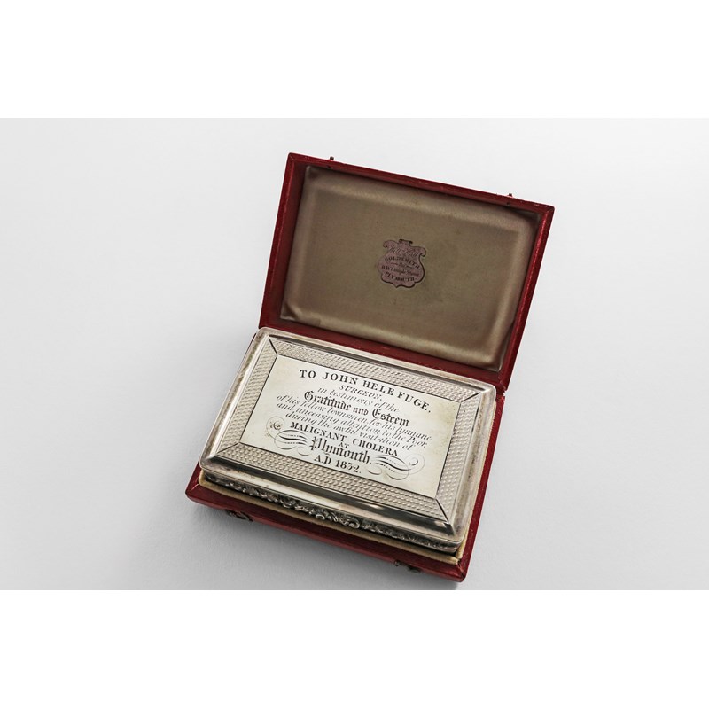 rectangular with reeded sides and base, a chased floral thumbpiece and an engine-turned border around the cover, inscribed "To John Hele Fuge surgeon in testimony of the Gratitude and Esteem of his fellow townsmen for his humane and unceasing attention to the Poor during the awful visitation of Malignant Cholera, Plymouth AD.1832", by Nathaniel Mills, Birmingham 1832, signed on the bezel "W Hall Fecit" and contained in its original case with the trade label of "William Hall Goldsmith 8 Whimple Street Plymouth"; 3.5" (9 cms) long; 4.5 oz