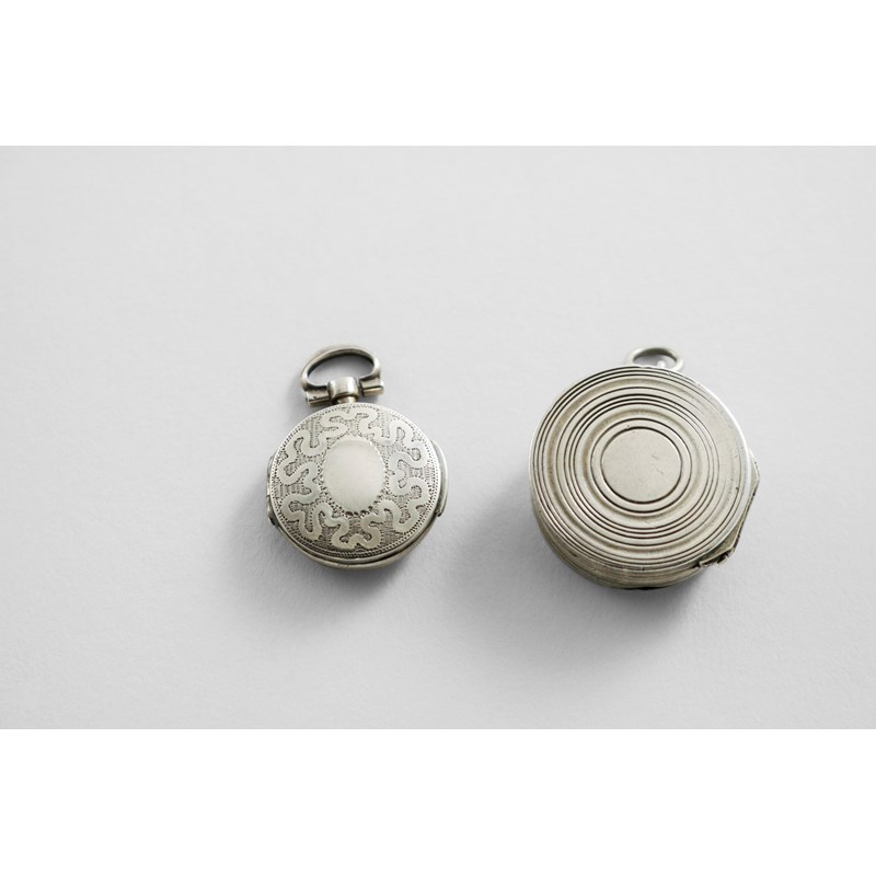 plain circular with reeded decoration, probably by William Parker & Benjamin Simpson, London 1800 and a George III smaller silver vinaigrette in the form of a watch, with engraved decoration, by Samuel Pemberton, Birmingham 1807; the latter 0.75" (2 cms) diameter; 0.7 oz (2)