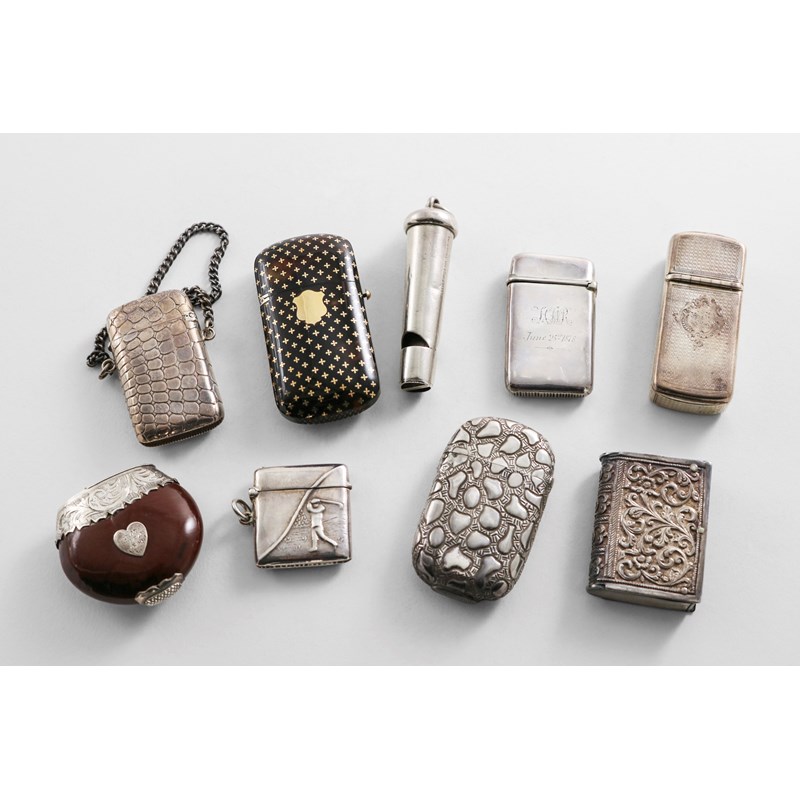 An Australian silver-mounted nut vesta with engraved mounts and a dedications, c.1890, a tortoiseshell vesta with gold inlaid decoration c.1900, an Indian silver vesta case, a French silver dual-compartment vesta case, another French silver vesta case, initialled & dated "1878", a Colonial silver vesta case with rounded ends and a textured finish (probably Australian/New Zealand c.1900), a Russian silver vesta case with a simulated snakeskin finish and a chain handle, St. Petersburg c.1885 (struck also with German marks), a late 20th century silver golfing vesta case and a Victorian whistle by Thomas Johnson, London 1873; the latter 2.75" (7 cms) long; 5.75 oz weighable silver ,(9)