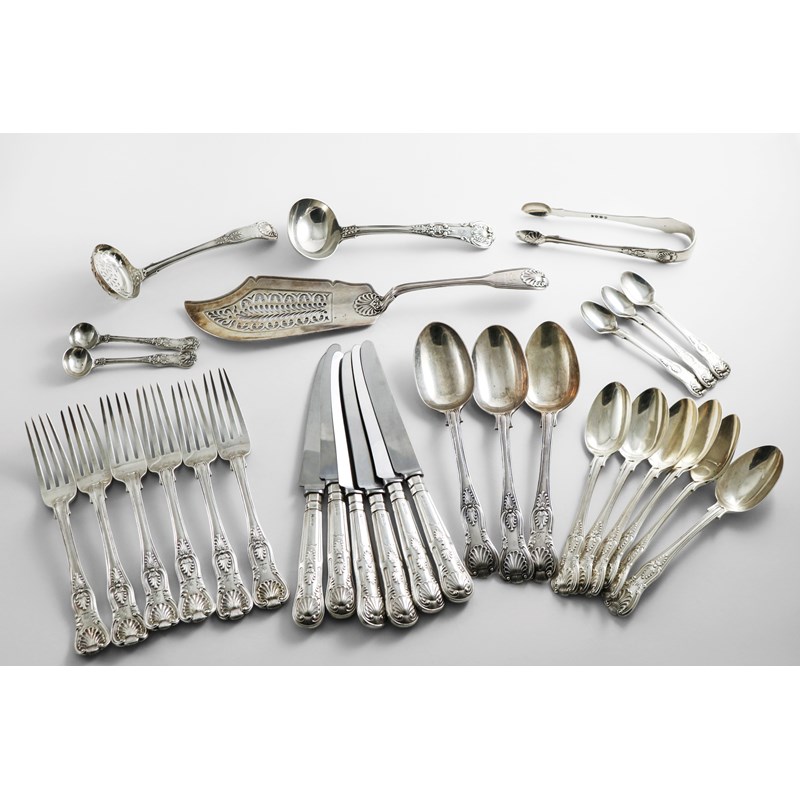 A QUANTITY OF ANTIQUE KING'S PATTERN FLATWARE (DIAMOND SHELL HEELS) TO INCLUDE:-