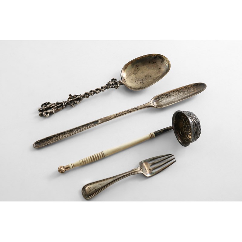 crested, marks distorted, a William IV toddy ladle with a turned ivory handle, an 18th century Dutch figure-terminal spoon, inscribed on the back of the bowl, and a small American fork; the latter 4.3" (11 cms) long; 4.2 oz weighable silver (4)