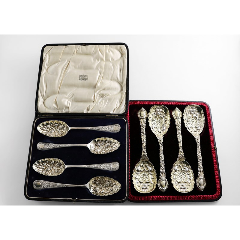 with embossed decoration, by Charles Edwards, London 1895 and another cased set of four fruit serving spoons by Walker & Hall, Sheffield 1897; 22.7 oz (2)