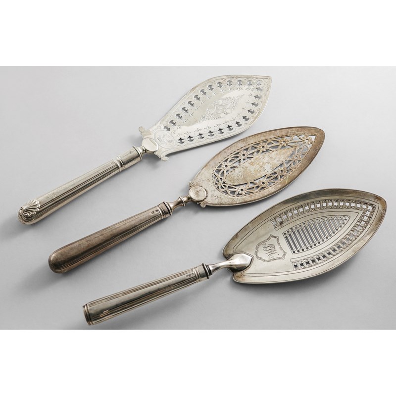 with a slot-pierced blade, border engraving, initialled, by Henry Chawner, London 1795 (later handle), another similar George III fish slice, crested, by William Plummer, London 1786 (later handle), and another, crested, by Peter & Anne Bateman, London 1794 (later handle); the longest one 12" (30.5 cms) long (3)