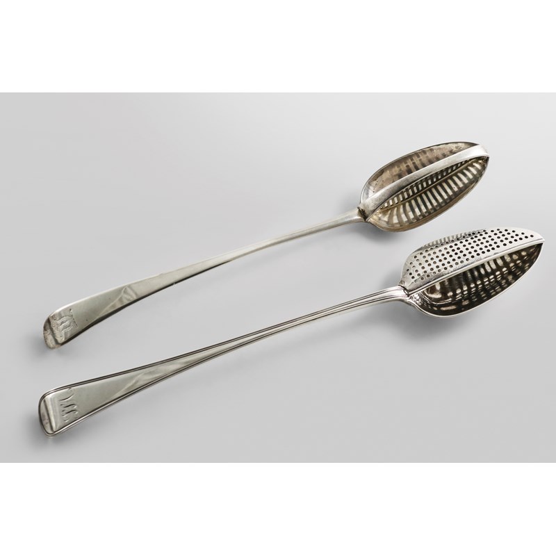 with a slot-pierced divider, crested, by Samuel Godbehere, London 1785 and an Old English Thread pattern strainer spoon, initialled "SSA" by Solomon Hougham, London 1796; the latter 12.2" (30.8 cms) long; 8.4 oz (2)