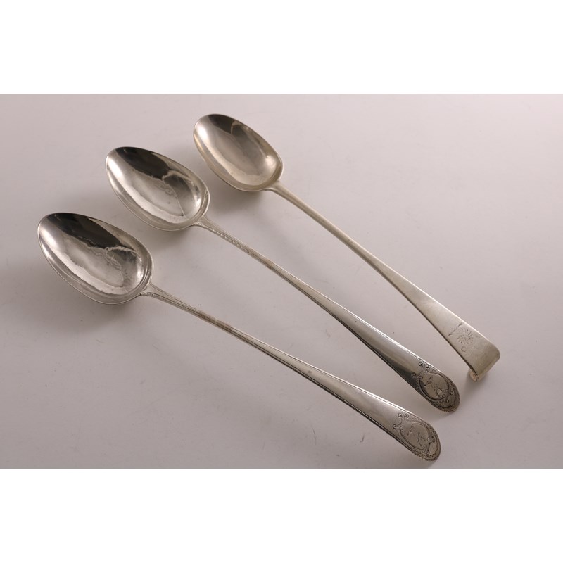 with chased cartouches, crested, by Michael Homer, Dublin 1777 and a George III Irish Hook-end basting spoon, crested, maker's mark worn, Dublin 1786; the latter 11.4" (28.6 cms) long; 9.1 oz (3)