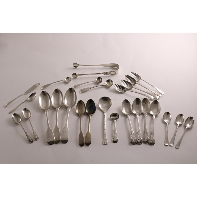 An Arts & Crafts spoon with a trefid terminal, initialled "GWJ", by Philip Frederick Alexander, London 1913, a pair of early Victorian Scottish sugar tongs, a set of three Newcastle Fiddle dessert spoons, initialled "L", and a quantity of other small assorted spoons, some with initials; the Arts & Crafts spoon 6" (15 cms) long; 16.8 oz (lot)