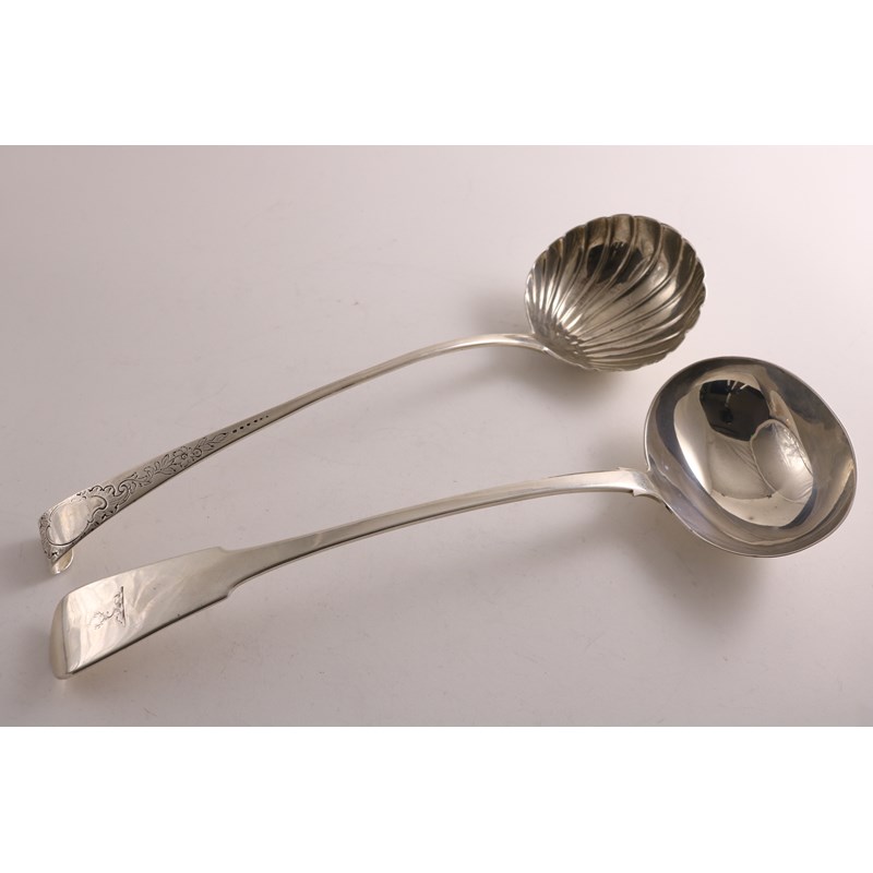 with a chased upper stem, probably by William Ward, Dublin 1774 and a Fiddle pattern soup ladle, crested, by James Brady, Dublin 1825; the latter 14" (35.6 cms) long; 14 oz (2)