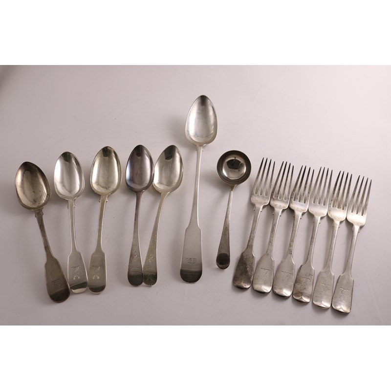 Fiddle pattern, initialled "GK", by Mitchell & Russell, Edinburgh 1811 together with six antique Fiddle pattern table forks, crested, George III Bead pattern sauce ladle and five various antique table spoons, all crested; the hash spoon 12.5" (32 cms) long; 30.8 oz (13)