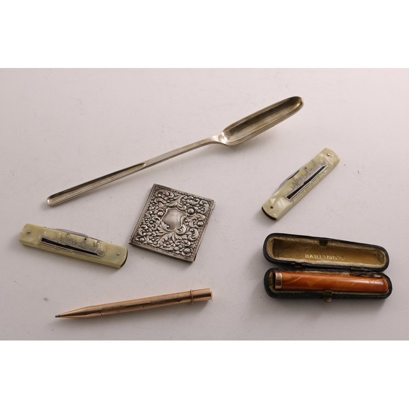 A 9 CT. GOLD CASED "EVERHARP" PENCIL An Elizabeth II period marrow scoop, a 9 ct. gold mounted cheroot holder (cased), two souvenir steel penknives with plastic sides "RMS SAMARIA" and an embossed stamp case; the latter 2.1" (5.5 cms) square (6)