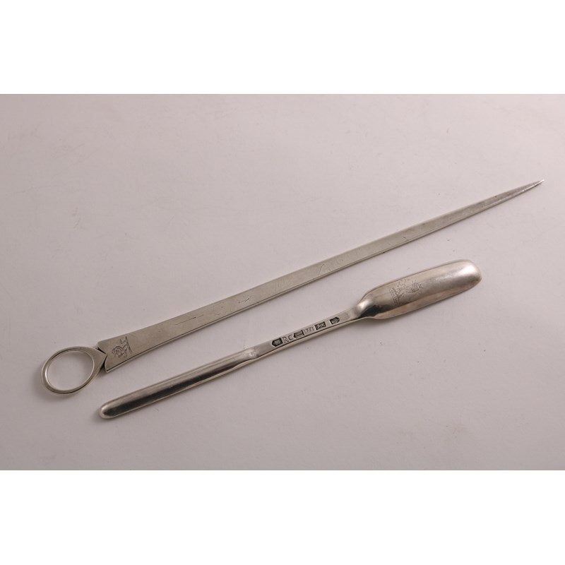 crested, and initialled "RC" and dated "1731" on the back of the stem, by Samuel Hutton, London 1730 together with a George III meat skewer, crested, by Thomas Watson, London 1791; the latter 12.25" (31 cms) long; 4.6 oz (2)
