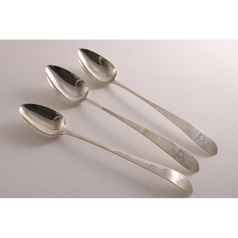 with pointed ends, crested, by John Keene, Dublin 1799 and another similar spoon, initialled "E" over "DT", by Jeremish D'Olier, Dublin 1788;  the latter 12.25"  (31 cms) long;  10 oz  (3)