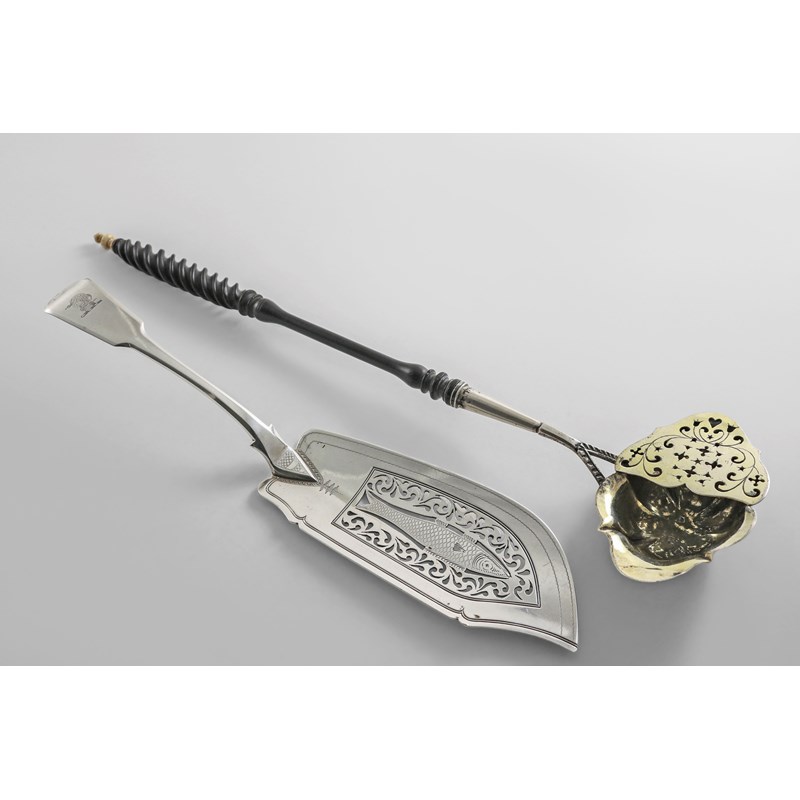 with a double tipped bowl, half covered with a decoratively pierced, gilt strainer, gilt interior also, the turned hardwood handle with a bone knop finial, maker's mark only "RM", struck twice, unascribed c.1770, together with a William Knight or William Kingdom, London 1833; the ladle 16" (41 cms) long; 4.9 oz