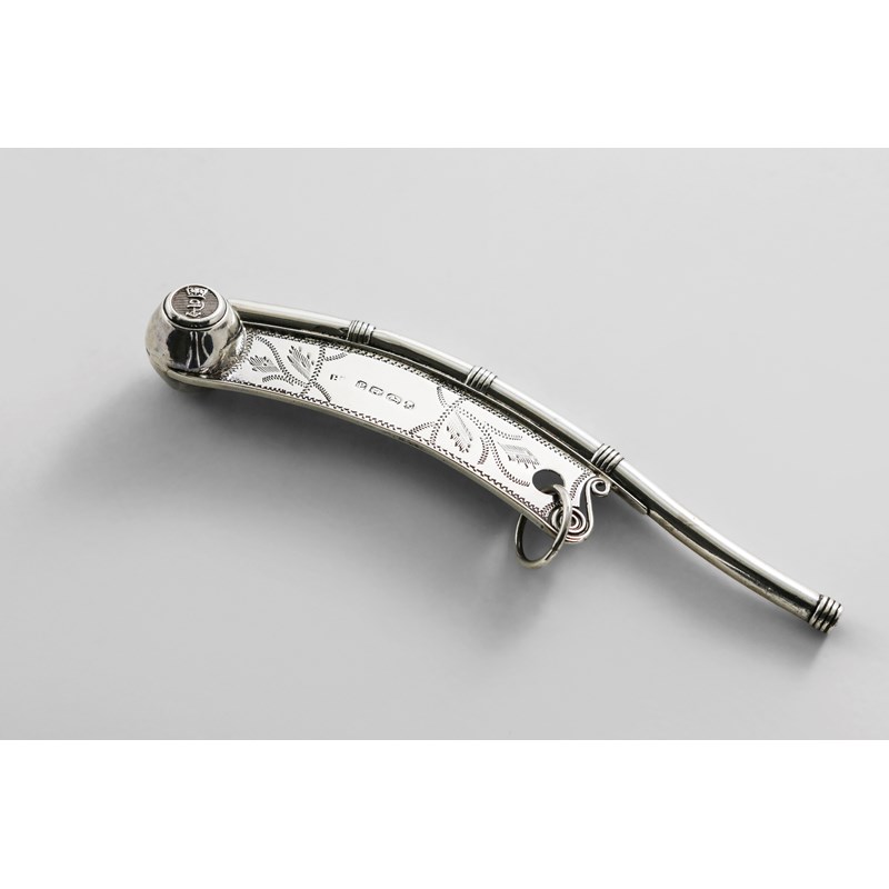 of conventional form with engraved decoration, the barrel-shaped terminal with a crowned, fouled anchor stamped on each side, maker's mark partially worn, "H?", Birmingham 1864; 5.3" (13.5 cms) long; 0.65 oz