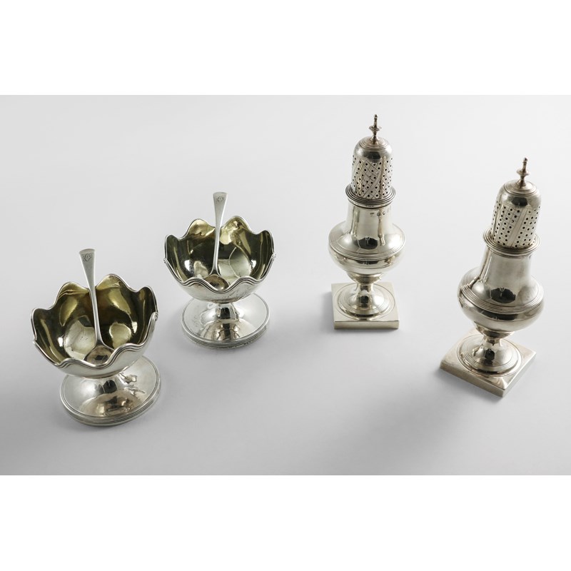 with wavy rims, reeded borders and gilt interiors, together with a pair of pepperettes on square pedestal bases with reeded borders, all by Peter, Anne & William Bateman, London 1800/01, together with a pair of salt spoons, initialled "O", by S. Godbehere, E. Wigan & J. Bult, London 1804; the salts 3.2" (8 cms) diameter; 13.4 oz (6)