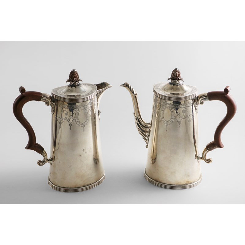 with tapering oval bodies, decorated with engraving around the upper bodies & covers, with mounted, carved wooden pineapple finials, maker's mark "MDY", Birmingham 1974; 9.9" (25.2 cms) high; 56.8 oz (2)