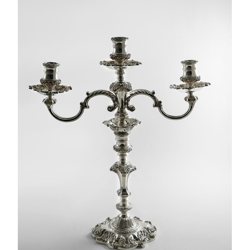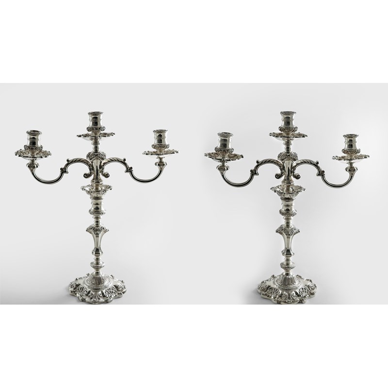in the style of a pair from the 1740's with matted shells in relief, scroll branches and shaped circular drip paw with scroll borders, the knopped and shouldered columns with spool-shaped capitals, by Mappin & Webb, London 1968/70; 15.7" (39.7 cms) high; 13.25" (33.8 cms) span of branches; 147.8 oz (2)