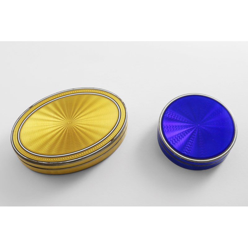 decorated with translucent yellow enamel over an engine-turned ground with white linear borders & English import marks for London 1912 and an early 20th century French circular box & cover with deep blue enamelled decoration; the latter 2.75" (7 cms) diameter; 11.3 oz (2)