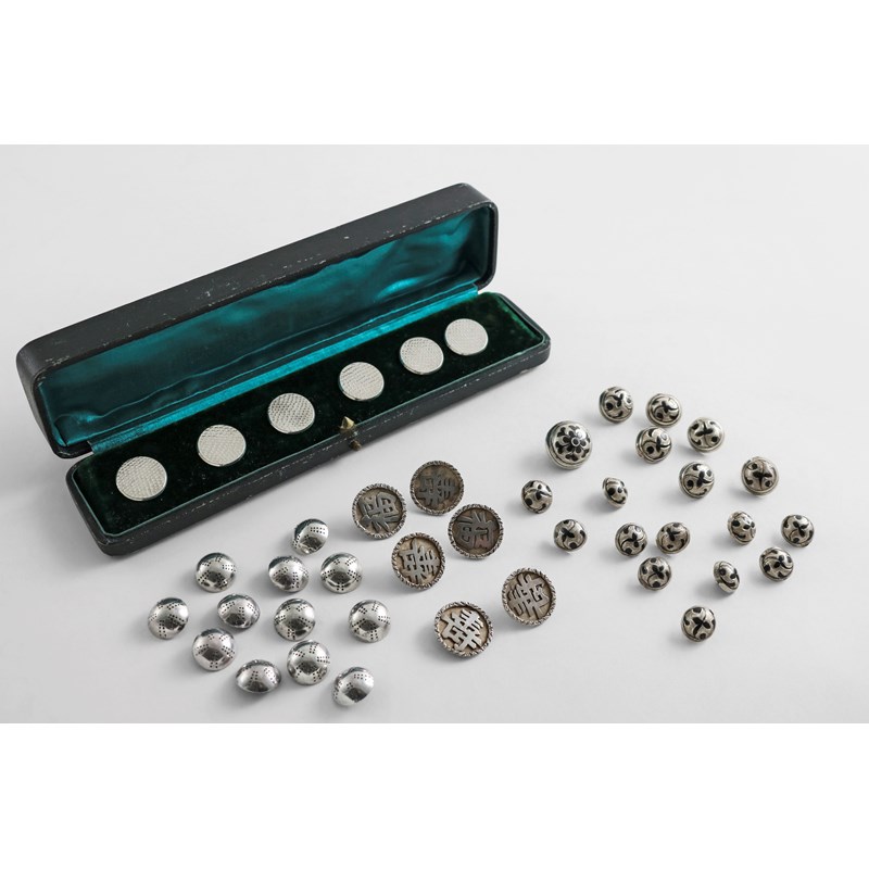 A cased set of six Edwardian buttons with a hammered finish, by Reynolds & Westwood, Birmingham 1902 together with a set of six Chinese buttons, eighteen Russian niellowork buttons and twelve Scandinavian buttons with pierced holes; the Chinese buttons 0.75" (2 cms) diameter; 2.4 oz (lot)