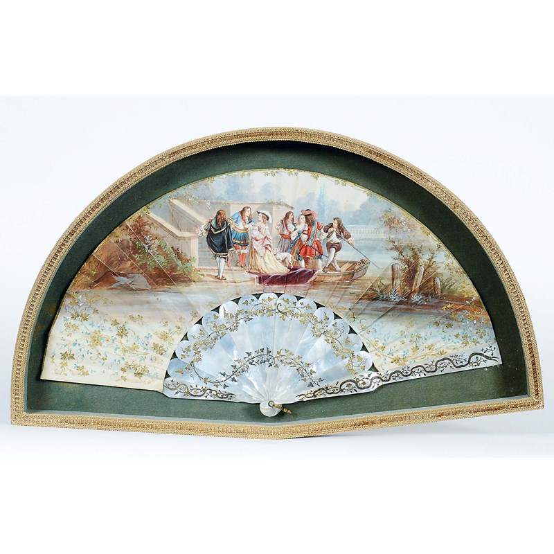 A FRENCH FAN with mother of pearl guards & sticks, engraved and gilt with trailing ivy, the paper leaves painted with a boating party disembarking, c.1870; 26 cms, in glazed frame