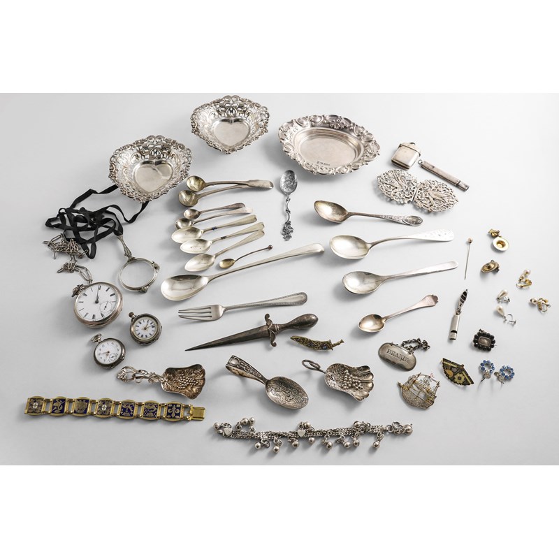 A two-piece buckle, a small spoon by Brian Fuller (boxed), other sundry small spoons, three bonbon dishes, a small fork, a gilt-metal & enamel bracelet, sundry small jewellery, three pocket watches, a chain, a wine label, two antique caddy spoons and small plated items to include a vesta case, a pair of lorgnettes, a whistle, etc.; the spoon by Brian fuller; 5.5" (14 cms) long; 14.3 oz weighable silver (lot)