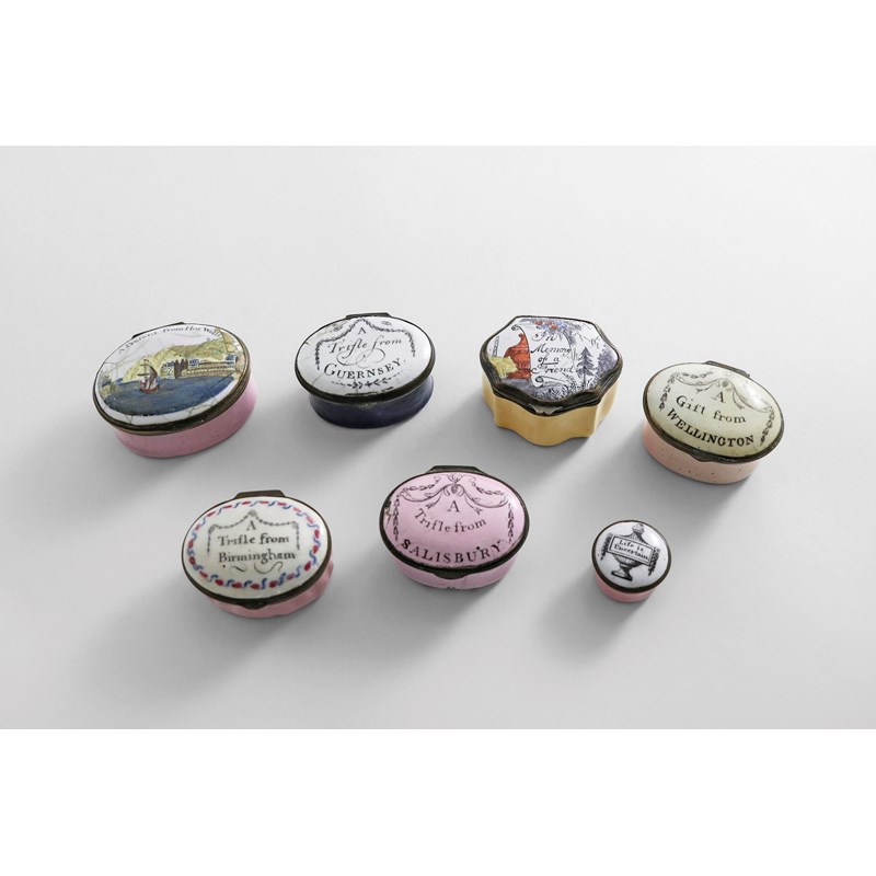 each with a printed message on the cover; "Life is Uncertain", "A Gift from Wellington", "A Trifle from Birmingham", "In Memory of a Friend", "A Trifle from Guernsey", "A Trifle from Salisbury" and "A Present from Hot Wells"; the latter 2" (5 cms) long (7)