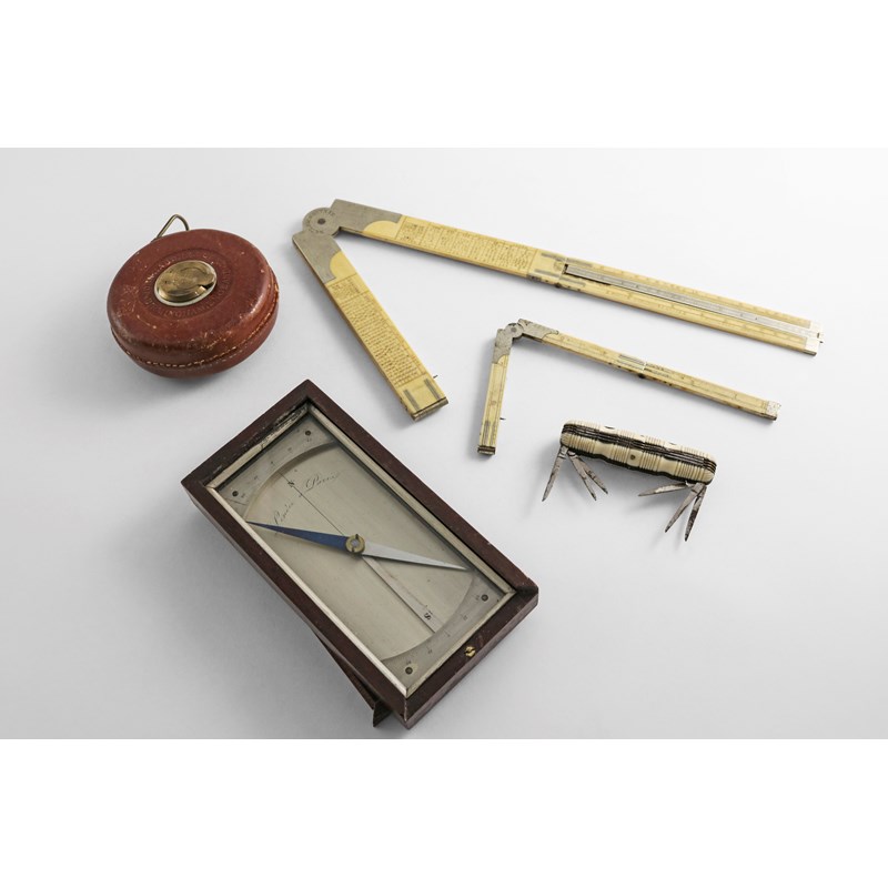 in a narrow oblong mahogany case with slide-open cover, (graduated only for 30 degrees East and West of North and South), by Lenoir a Paris, c.1820 together with two nickel-mounted ivory folding rules; the larger one signed "NETLAM RATTRAY", a leather "Rabone" 33 foot tape measure, and a 19th century ivory-mounted steel pocket knife with rounded ends and twenty four fold-out penknife blades; the compass 6.6" (17 cms) long (5)