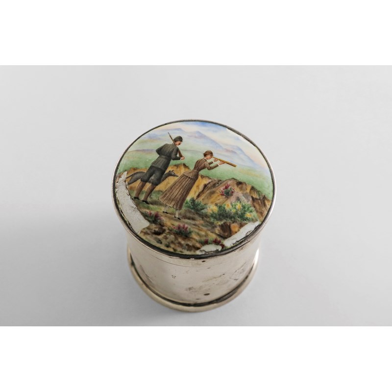 the hinged cover enamelled in polychrome with a lady & gentleman deer-stalking in the Highlands, by Hubert Thornhill (for Thornhill & Co, 144 Bond St.), London 1888; 2.75" (7 cms) high; 5.1 oz