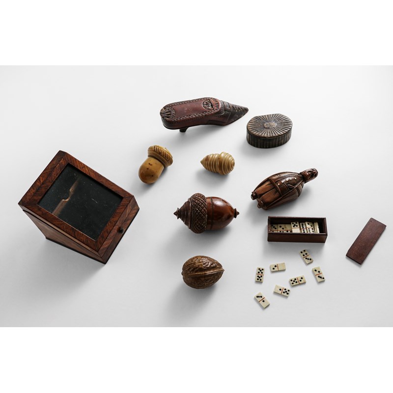 A Victorian Kingwood-veneered watch holder with a glazed, sloping front, a carved wooden thimble case in the form of a walnut (with thimble), a papier-mache snuff box, three various carved coquilla-nut thimble cases in the form of acorns (two with thimbles), a miniature box containing miniature bone dominoes, a carved wooden shoe snuff box with a slide cover, and a carved novelty coquilla-nut snuff box in the form of a portly gentleman; the latter 3.3" (8.3 cms) high (lot)