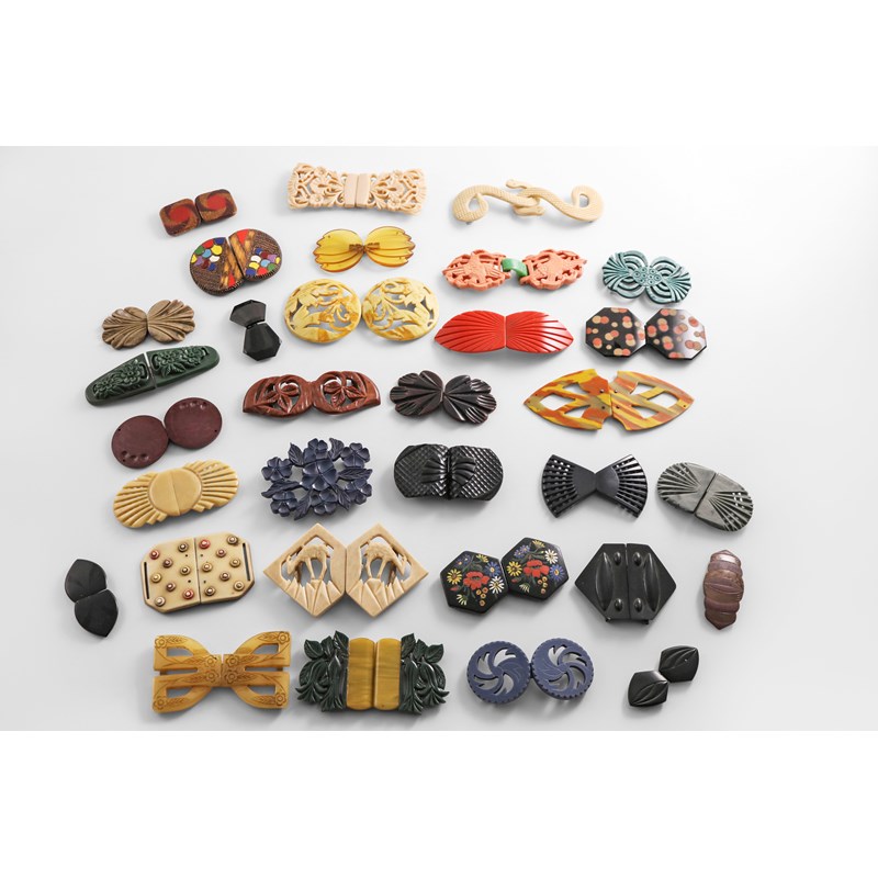A QUANTITY OF ART DECO AND LATER 20TH CENTURY BUCKLES in a variety of colours and materials (resin, early plastics 7 wood); the largest one 5.5" (14 cms) long (lot)