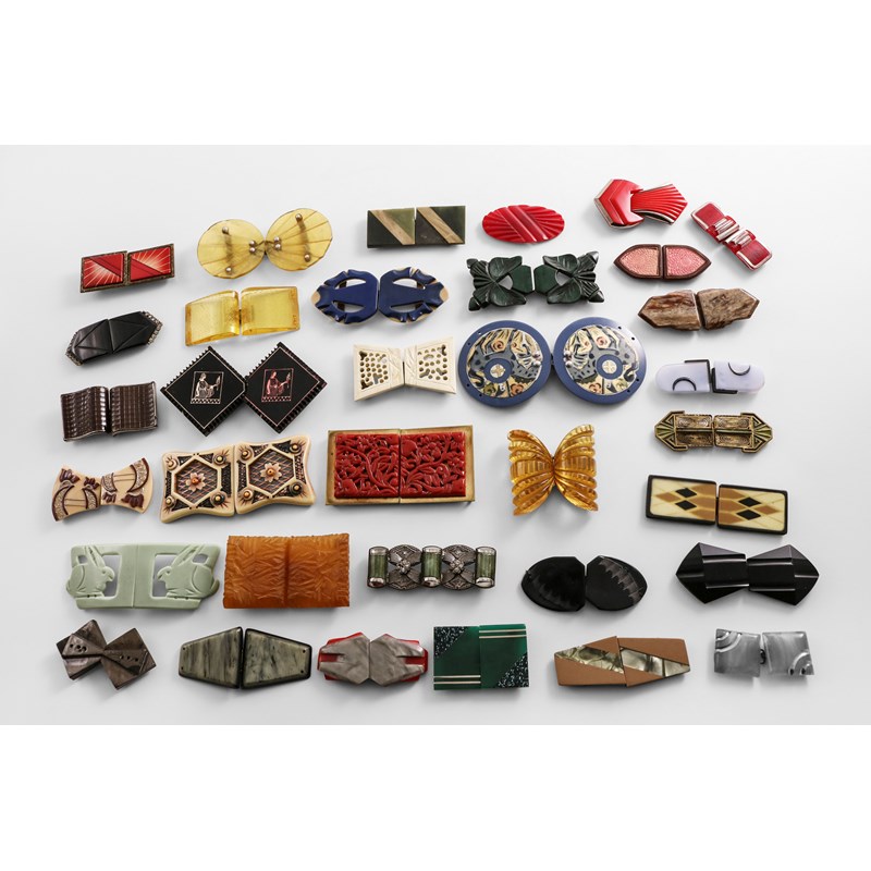 THIRTY FOUR VARIOUS ART DECO BUCKLES All two-piece and in a variety of non-precious materials (early plastics, resin, etc.); the largest one 3.5" (9 cms) long (34)
