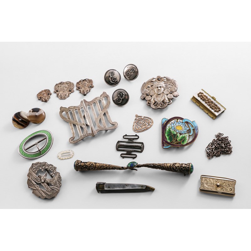 An Edwardian silver buckle of shaped oval outline, pierced with a deer in woodland, by Hutchinson & Co., Birmingham 1902, a green enamelled oval buckle by Levi & Salaman, Birmingham 1910, a slot-pierced buckle by A.J. Smith, Birmingham 1908, two gilt-metal clasps, an electroplated Art Nouveau buckle with a female mask & flowers and three matching graduated belt mounts, an agate toggle, a bronze buckle, three plated buttons, etc.; the largest buckle 3" (7.5 cms) long; 2.25 oz weighable silver (lot)