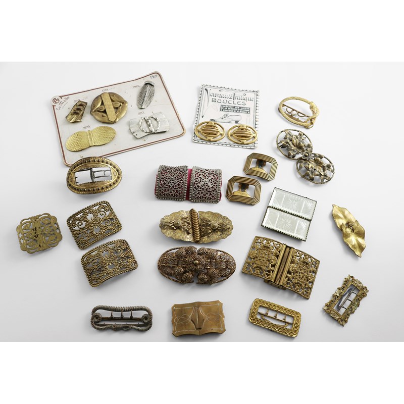 A QUANTITY OF DECORATIVE GILT-METAL / BRASS BUCKLES mostly 20th century (some on advertising cards), including two with serpents and a glass mirror buckle; the latter 2.5" (6 cms) square