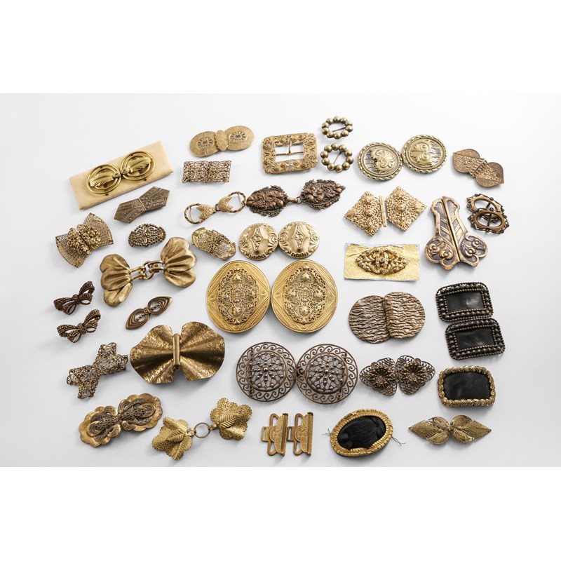 A QUANTITY OF GILT METAL / BRASS BUCKLES of mixed designs and dates, 19th and 20th century; the largest one 5.6" (14.5 cms) long (lot)