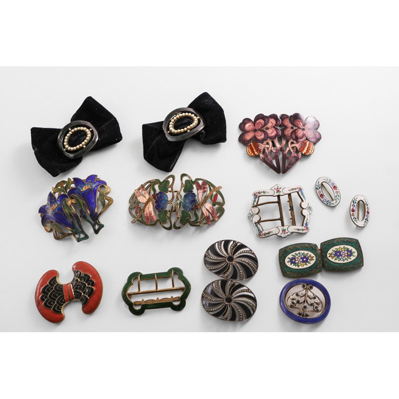 THREE ART NOUVEAU ENAMELLED BUCKLES with floral decoration, two pairs of oval enamelled buckles, and seven others; the largest one 3.5" (9 cms) long