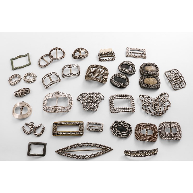 A pair of late 18th century German small silver buckles, maker's mark "WO", Furth, 1760-90, a 19th century Dutch silver buckle, an American oval silver buckle and two bronze buckle chapes; the largest one 5" (12.5 cms) long (lot)