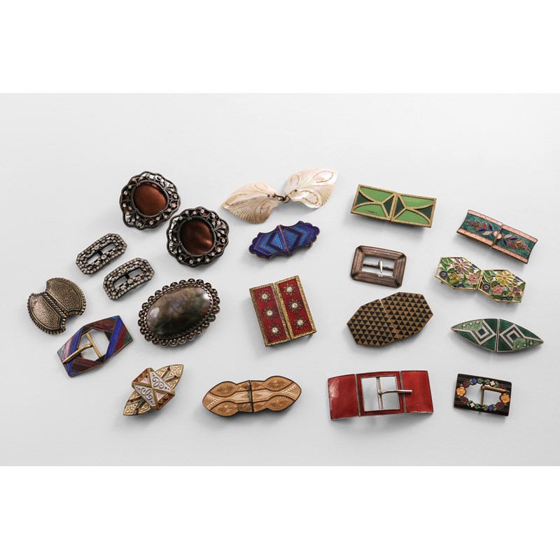two pairs of paste-set buckles, a brass & black painted buckle, a carved mother of pearl buckle and an oval, agate-set buckle; the latter 2.5" (6.5 cms) long (20)
