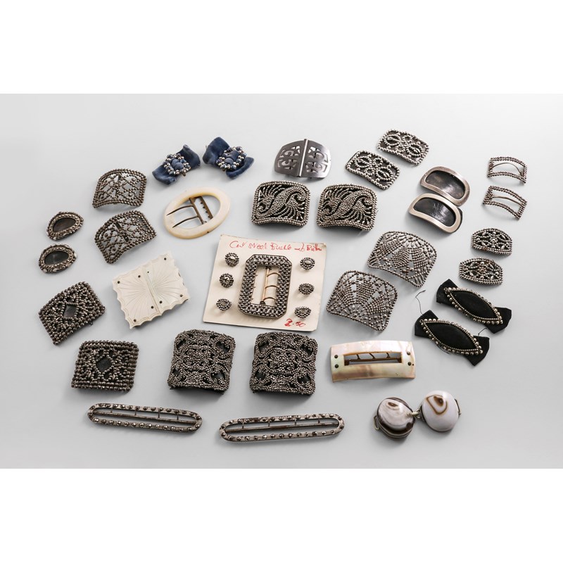A gun-metal buckle, a pair of steel buckles, an agate buckle, a cut-steel buckle with six cut-steel buttons (on a card) and three mother of pearl buckles; the largest ones 4.2" (10.6 cms) long (lot)