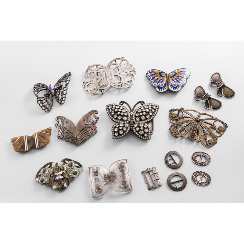 by C.H. Cheshire, Chester 1910, two pairs of small hallmarked buckles, a single small hallmarked buckle and ten other various buckles, each shaped like or resembling a butterfly, in a variety of non-precious materials (glass, mother of pearl, enamel plastic, etc.); the paste-set butterfly buckle 3.4" (8.7 cms) long (16)