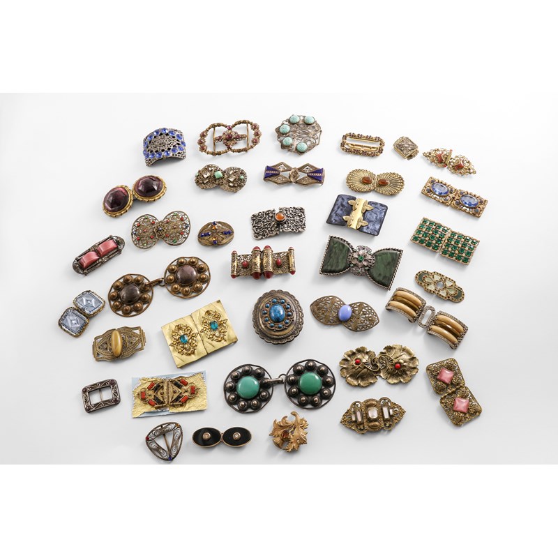 A QUANTITY OF CUSTOME BUCKLES mainly 20th century & gilt metal / brass, each one set with paste or imitation coloured stones; the largest one 3" (7.5 cms) long (lot)
