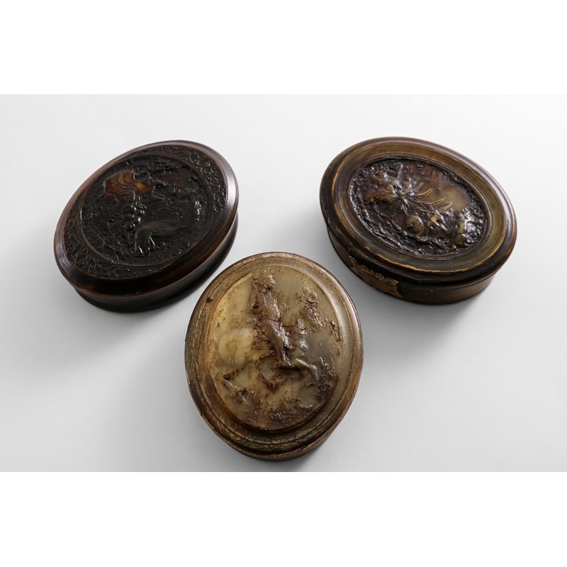 with a brass "butterfly" hinge, the cover impressed with the conversion of Saul, unmarked, probably by John Obrisset, another oval pressed horn box & cover depicting a profile bust of Charles I in armour (after Roettiers) within a legend, signed "OB", by John Obrisset and another with an equestrian figure "The Great Champion of England", also signed "OB", by John Obrisset, the base incised "C.R" and date "1765", each approx. 4.2" (10.5 cms) long (3)