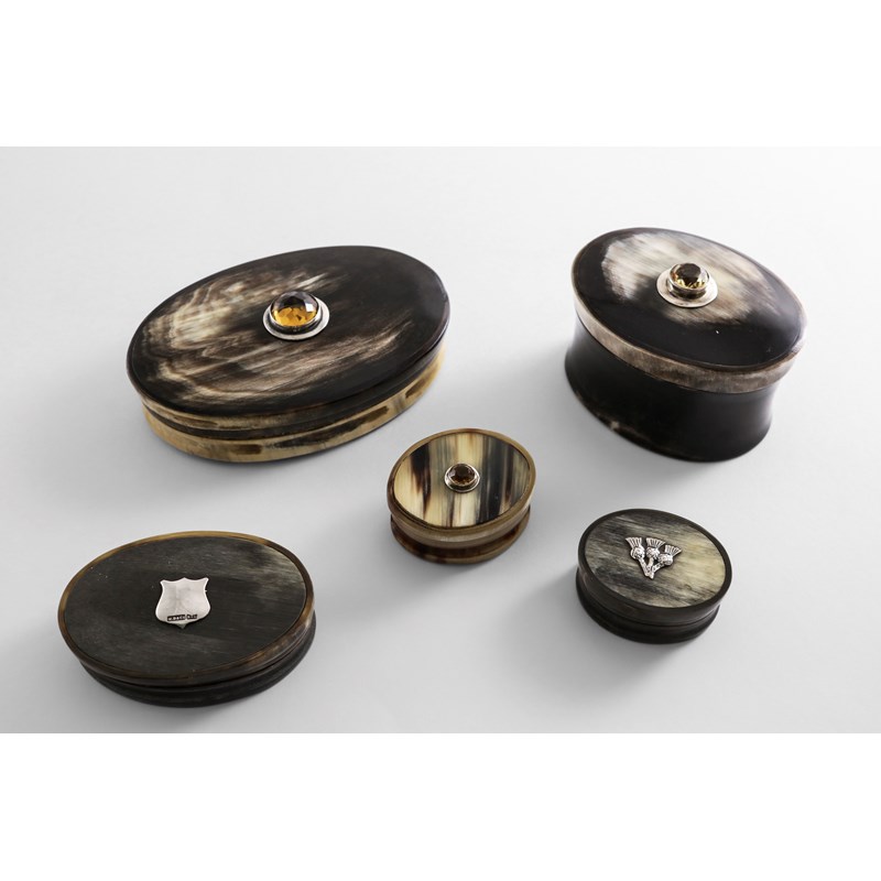 Three late Victorian/Edwardian Aberdeen, mounted horn snuff boxes, each set with a faceted citrine boss on the cover, together with another with applied thistles and another with a shield cartouche, the latter with maker's mark of William Dunningham & Co. of Aberdeen; the largest one 4.4" (11 cms) (5)