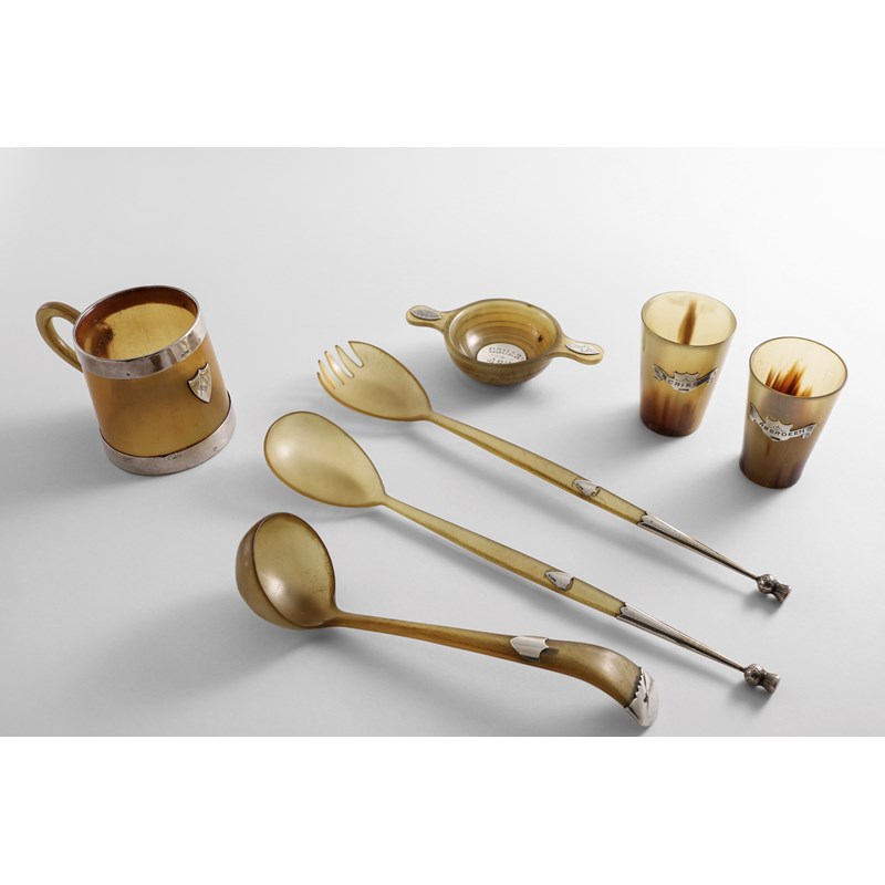 An early 20th century mounted horn mug, the cartouche engraved with a Masonic emblem, by William Dunningham & Co. of Aberdeen, hallmarked "Edinburgh 1911", together with two small mounted horn beakers, by the same maker (one inscribed "CRIEFF", the other "ABERDEEN"), a pair of Scottish mounted horn salad servers, a mounted horn toddy ladle by J. Cook & Son, Birmingham 1907, and a mounted horn quaich inscribed "SGUAB AS'I" by Dunningham & Co. of Aberdeen, hallmarked "Edinburgh 1910"; the latter 4.5" (11.4 cms) long (7)