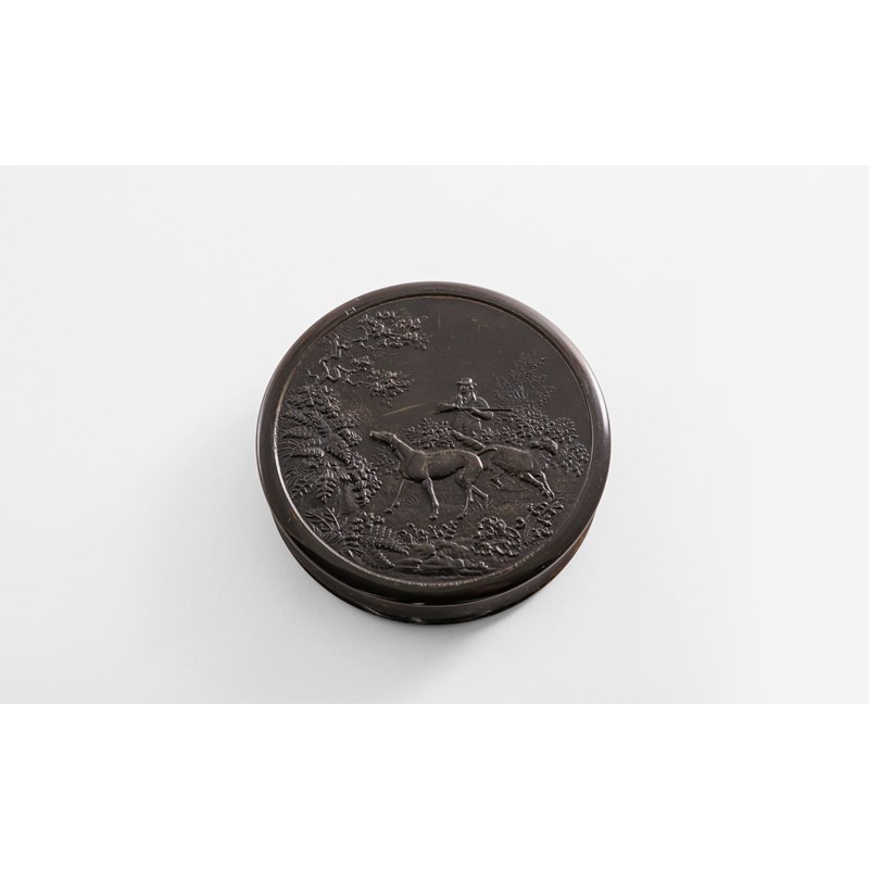 the cover depicting a hunter with gun and two dogs, a pointer and a setter, the base centred by a stylised flower head within a border of weaving and band of thistles, the cover stamped "Wilson"; 3.3" (8,.5 cms) diameter