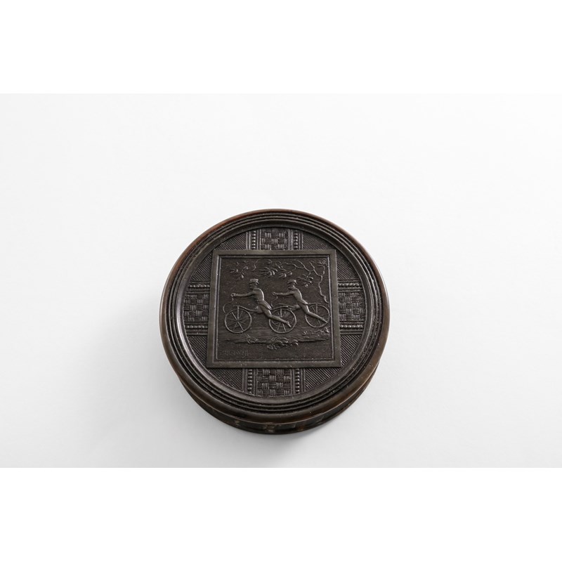 An early 19th century circular pressed horn snuff box, the pull-off lid pressed with two cyclists on early "Hobbyhorse" bicycles within a square frame over a central "basket weave" cross formation, within a reeded border (signed Bradwell), the base with a flower and acorn rosette inside a square frame on a basket weave ground within a reeded border; 3.1" (7.8 cms) diameter.