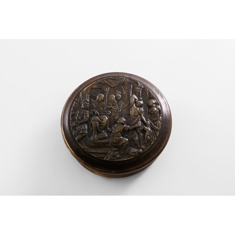 with ring-turned base and incuse sides, the cover impressed with a scene depicting "The Judgement of Solomon", unsigned, but attributed to John Obrisset; 3.7" (9.3 cms) diameter