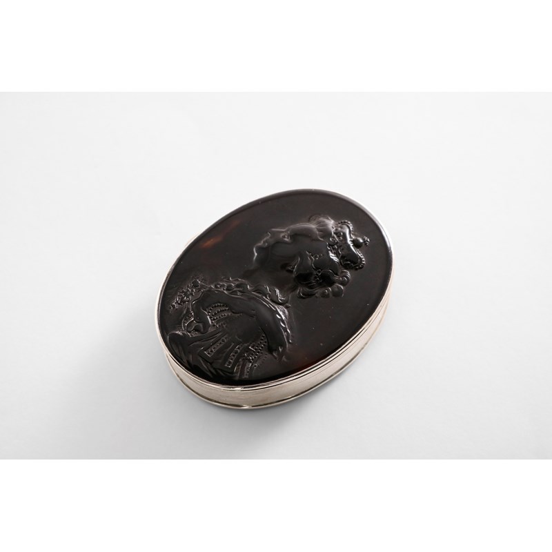 with a tortoiseshell base, the cover inset with a pressed tortoiseshell plaque, with a portrait of Queen Anne in relief on the cover, the plaque by John Obrisset, (unsigned), gilt interior; 2.55" (6.5 cms) long