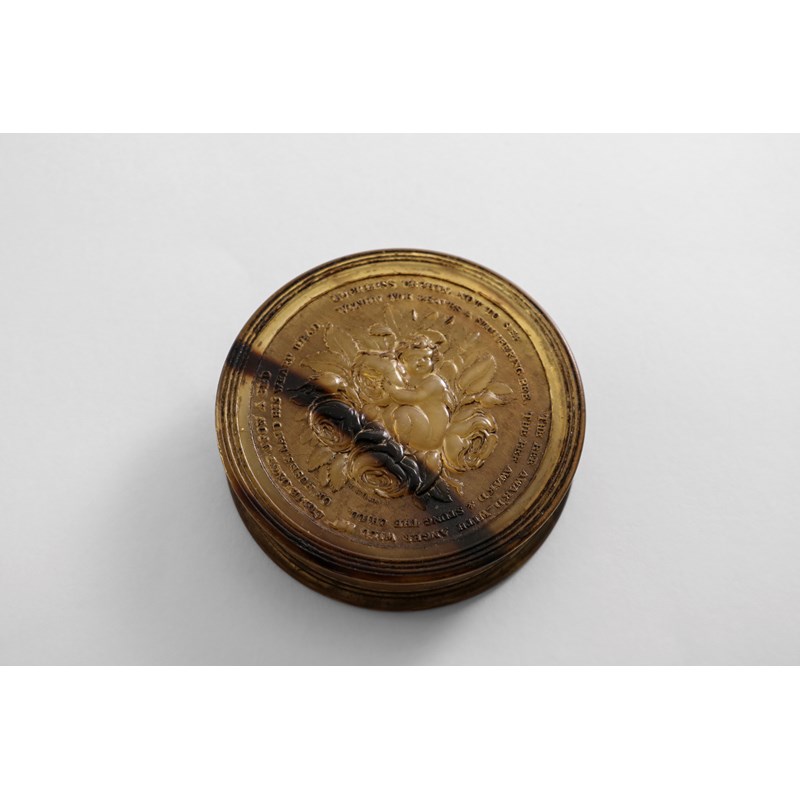 A GEORGE III PRESSED HORN CIRCULAR SNUFF BOX of translucent blond colour, the cover with a dark brown steak and pressed with Cupid and a bee within roses and with a verse in two lines around the inner edge within a reeded border, signed "W.Wilson J", the base with trailing vines around a rosette centre, 1810-1820; 3" (7.3 cms) diameter Note: For examples from Phillips' personal collection, see Sotheby's auction catalogue of "Fine Tobacco and Snuff Boxes" The Property of Philip A.S. Phillips, Esq. (dec'd), 4th July 1934" included in lot 62.
