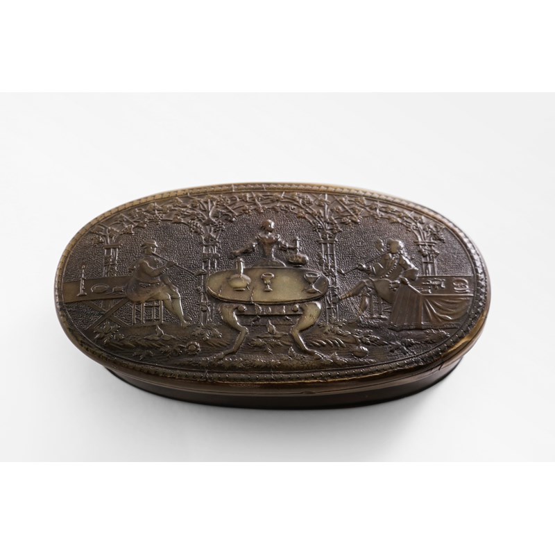 with cover depicting two gentlemen smoking pipes at side tables, a serving maid behind a central table with two wine glasses and a decanter, with arcaded vines in the background & an acanthus leaf border, probably Dutch; 5.25" (13 cms) long